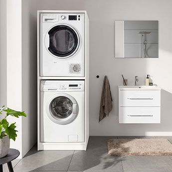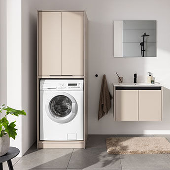 Mit ihrem klaren, reduzierten Design passen die Hauswirtschaftsraumschränke perfekt in moderne Badezimmer ebenso wie in funktionale Nutzräume. Die Dekore Weiß und Kaschmir wirken zeitlos, hell und hochwertig.