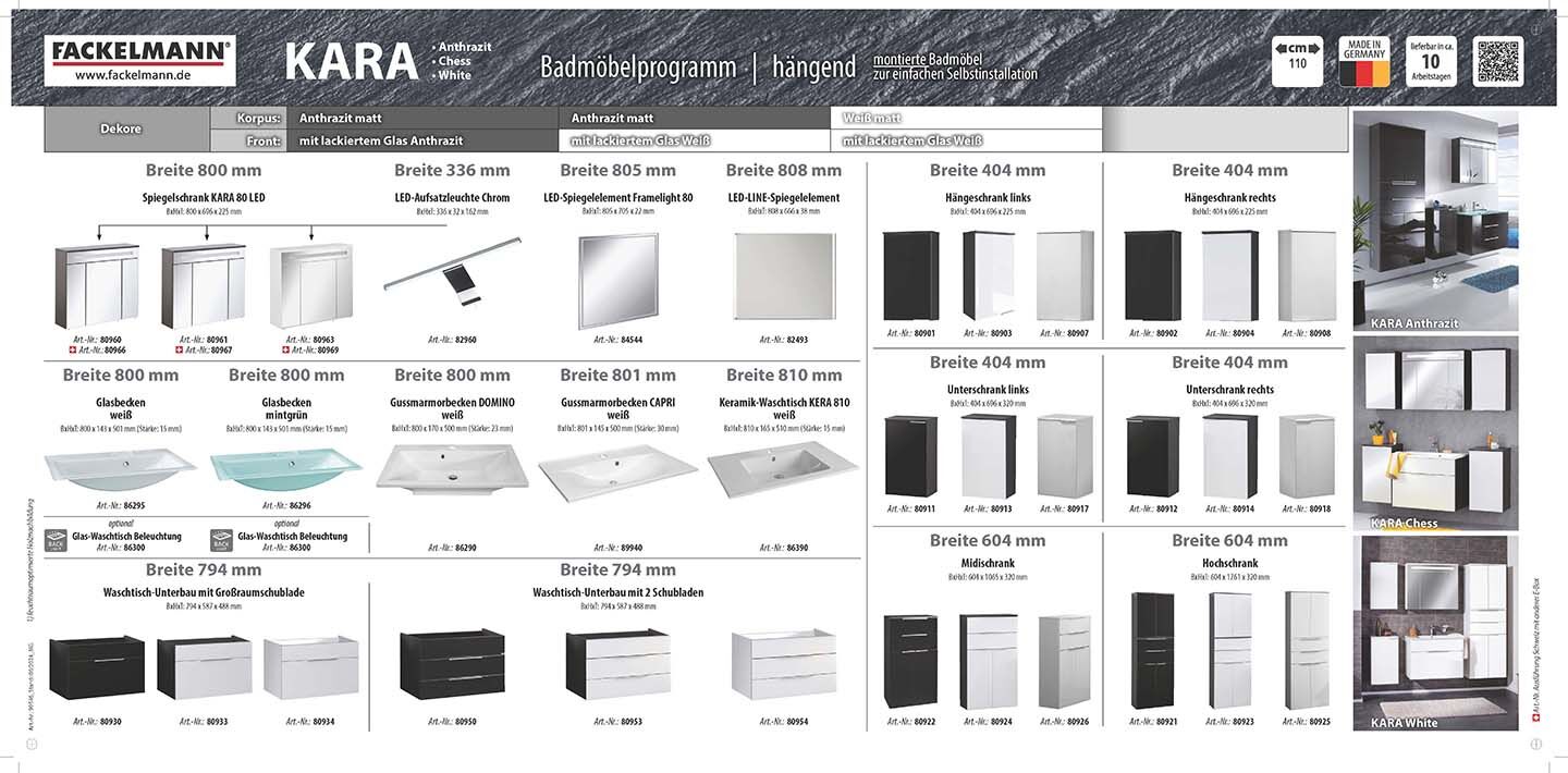 Fackelmann steht seit Jahren für innovative Lösungen und höchste Qualitätsstandards. Mit der Serie Kara profitierst Du von modernem Design, langlebigen Materialien und einer einfachen Installation. Ob Du Dein Bad modernisieren oder neu gestalten möchtest – diese Badmöbel sind die perfekte Wahl.