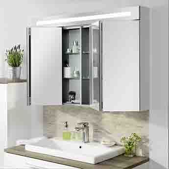 Der Spiegelschrank aus der Stanford-Serie ist ein echtes Highlight. Mit seinen innovativen Falttüren und der integrierten LED-Beleuchtung sorgt er nicht nur für perfekten Durchblick, sondern setzt Ihr Badezimmer ins rechte Licht. Zusätzliche Stauraumwunder bietet die durchdachte Ausstattung mit Steckdose und Schalter, damit elektrische Geräte wie Föhn oder Rasierer bequem genutzt werden können.