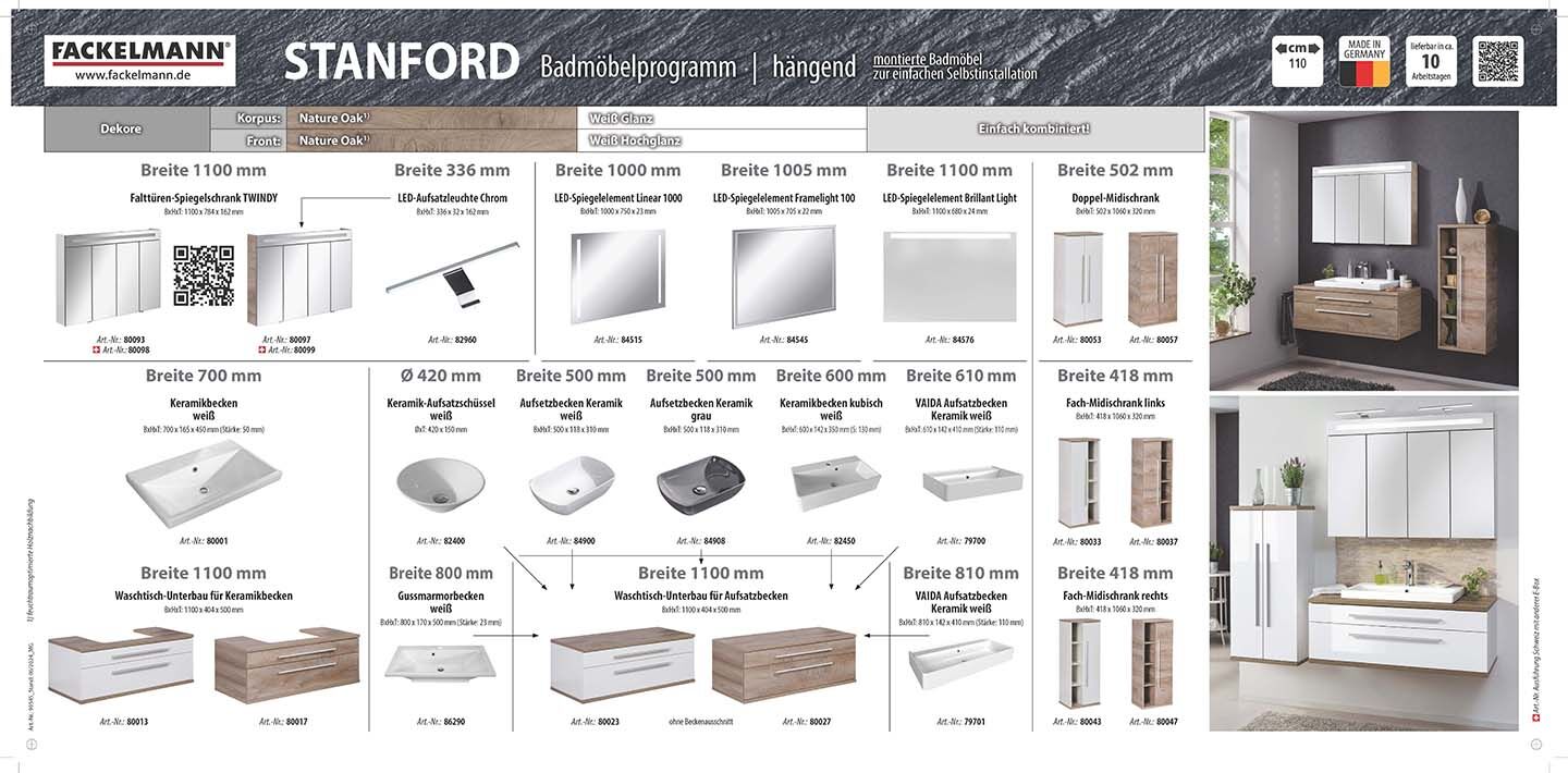 Die Badmöbelserie Stanford ist nicht nur ein Blickfang, sondern auch äußerst funktional. Alle Möbelstücke werden bereits vormontiert geliefert, was Dir Zeit und Mühe spart. Typisch Fackelmann, stehen Qualität und Langlebigkeit im Fokus – Made in Germany garantiert höchste Standards.